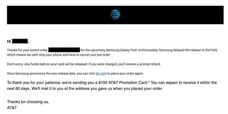 所以原定计划本应在4月底上市的Galaxy Fold却迟迟没能上市,并且三星正在对其部分部件进行重新设计。现在,美国运营商AT&T宣布,已经取消了售价2000美元的三星折叠手机Galaxy Fold的预购订单,并将向提前订购的客户提供100美元的补偿。在这之前,百思买也取消了预售订单,因为三星无法在5月31日之前发货。