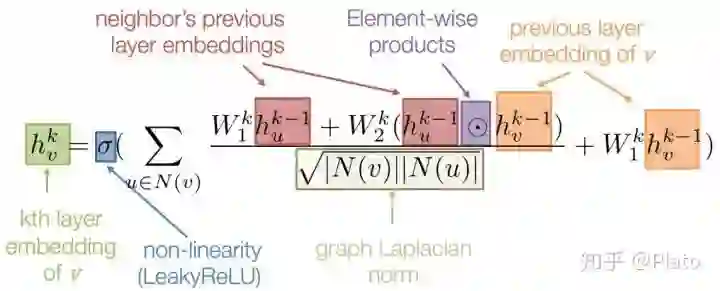 在NGCF中,第k-1层的节点信息是这样聚合到第k层的: