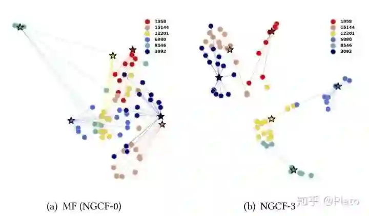 在用t-SNE降维后,下图是对NGCF与MF的embedding可视化。星星是一个用户,圆圈是一个物品。可以看到NGCF的clusters彼此之间更加分离,即同一个用户交互过的物品,它们的embeddings更加相似。