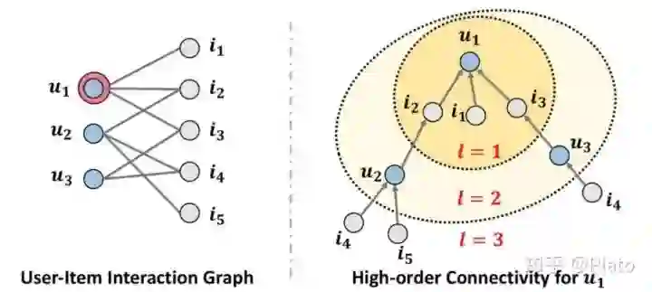 作者希望使用GNN对高阶交互历史进行建模,就首先要对交互历史进行构图。左图是由用户、物品的交互历史构成的二部图;右图是将左图围绕
