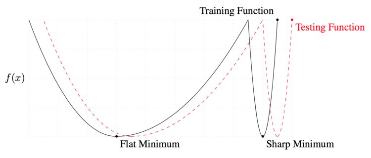 判断解决方案好坏的一个标准就是该方案解的平滑性。 这一思想在于训练数据和测试数据会产生类似的但并不完全一样的损失面。你可以想象一下,一个测试表面相对于训练表面移动一点。对于一个局部解,在测试过程中,因为这一点移动,一个给出低损失值的点会给出一个高损失值。这意味着这个”局部“解决方案没有产生最优值——训练损失小,而测试损失大。另一方面,对于一个”全局“平滑解决方案,这一点移动会导致训练和测试损失的差值很小。