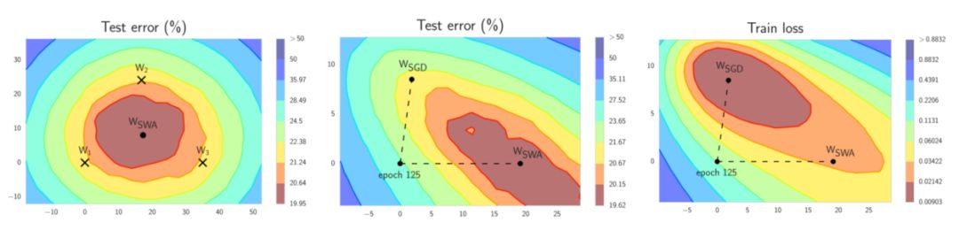 SWA的灵感来自于实际观察,每次学习率循环结束时产生的局部最小值趋向于在损失面的边缘区域累积,这些边缘区域上的损失值较小(上面左图中,显示低损失的红色区域上的点W1,W2和W3)。通过对几个这样的点取平均,很有可能得到一个甚至更低损失的、全局化的通用解(上面左图上的Wswa)。