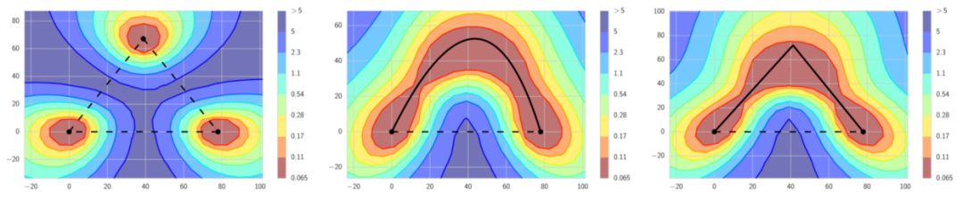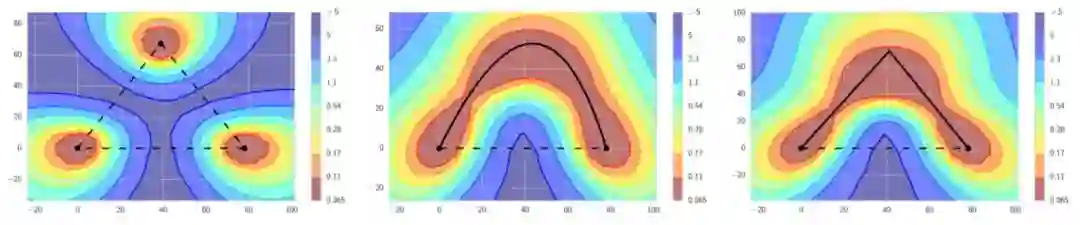 左边:传统观点认为好的局部最小值被高损失区域分隔开。如果我们观察连接局部最小值的直线,会发现这是正确的。中间和右边:然而,在局部最小值之间存在通路,这些通路上的损失值始终很低。FGE沿着这些通路拍快照,并利用这些快照构建一个集合。