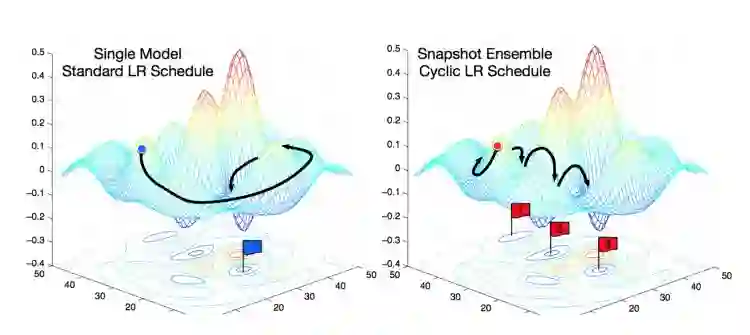 最初,随机梯度下降(SGD,Stochastic Gradient Descent) 会在权重空间产生大的跃变。随后,当学习率由于余弦退火算法越来越小时, SGD 会收敛到某个局部解,该算法会对模型拍个”快照“,即将这个局部解加入到集合中。接着,学习率再次被重置成高值,SGD在收敛到某个不同的局部解之前,再次产生一个大的跃变。