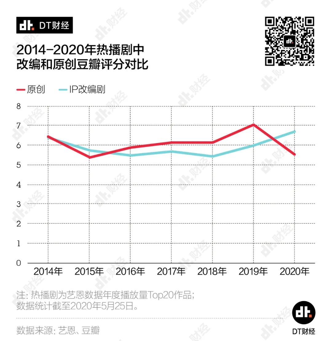 2015年到2019年间,热播剧中改编剧的平均口碑均不敌当年的原创作品,连续4年豆瓣均分都处于6分及格线以下。