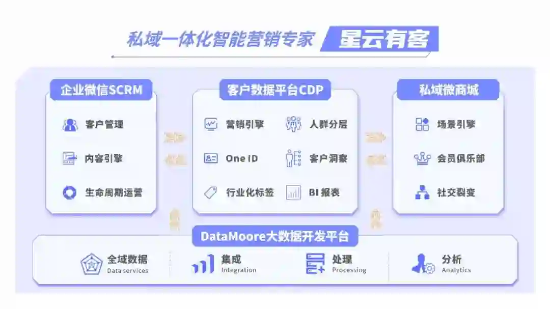 在星云有客看来,品牌方构建私域应用有五个核心的元素,会员、数据、内容、社群、场景,私域完成了这五元素的核心构建,才有可能形成私域的商业闭环,这些也是品牌方关心的。而星云有客过去的能力和经验完全覆盖了上述核心的五元素,一体化产品系统核心正是以五元素为理念构建完成的。所以在搭建产品时,星云有客从最底层的根基搭建,先将大数据开发平台DataMoore具备一定PaaS和低代码的能力,解决品牌最关心的数据问题,再通过客户数据平台CDP,强化品牌的会员和营销自动化的能力,最后通过企业微信SCRM和私域微商城,实现对应的社群和内容的触达和闭环。