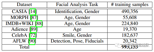 All-in-One Face网络架构使用预训练验证网络Sankararanayanan[25],包含七个卷积层,之后是三个全连接层。该网络被用作人脸部进行训练的主干识别任务。来自前6个卷积的参数此网络的层在其他面相关中共享任务如下图所示。针对人脸识别任务的CNN预训练提供了对通用人脸分析任务的更好的初始化,因为过滤器保留了区别人脸信息。