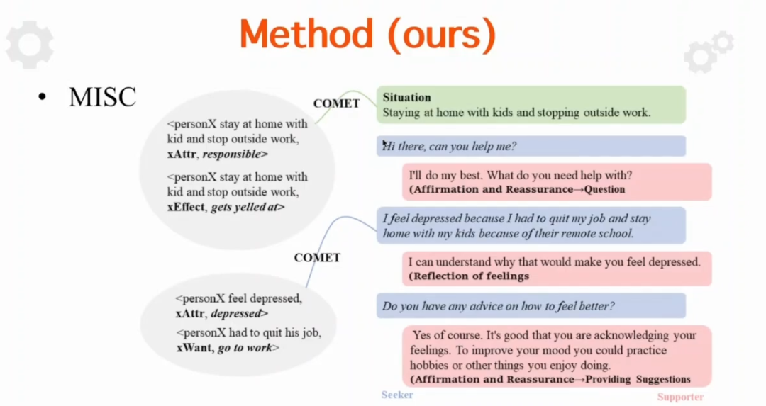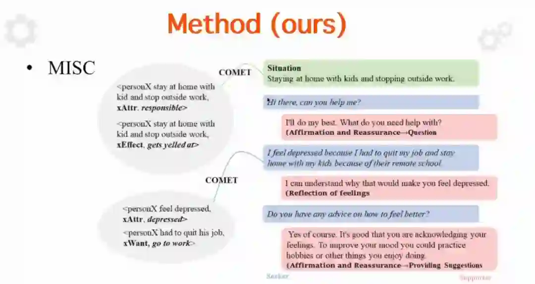 在下午的分享中,小米人工智能实验室高级算法工程师李嫣然、字节跳动 AI Lab 研究员鲍宇、西安大略大学 / 矢量人工智能研究所博士生王馨頔、中科院自动化所模式识别国家重点实验室博士生林海涛、北京航空航天大学博士生王冰分享了他们的最新成果。 李嫣然的分享主题是「基于混合策略和常识图谱的情绪疏导对话」,主要围绕他们的 ACL 2022 接收论文《MISC: A Mixed Strategy-Aware Model integrating COMET for Emotional Support Conversation》展开。在这篇论文中,他们提出了一种新的情绪疏导对话模型——MISC,该模型首先推断用户的细粒度情绪状态,然后使用混合策略巧妙地做出反应。