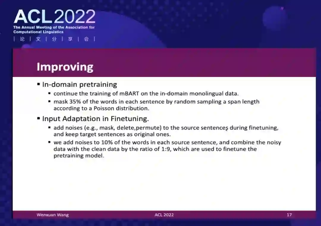 魏相鹏的分享主题是「基于连续语义增强的神经机器翻译」,主要围绕他们的 ACL 2022 接收论文《Learning to Generalize to More: Continuous Semantic Augmentation for Neural Machine Translation》展开,该论文也获得了今年 ACL 杰出论文奖。在这篇论文中,他们提出了一种新的数据增强范式连续语义增强(CSANMT),它为每个训练实例增加一个邻接语义区域,该语义区域可以覆盖足够的相同含义下的文字表达变体。
