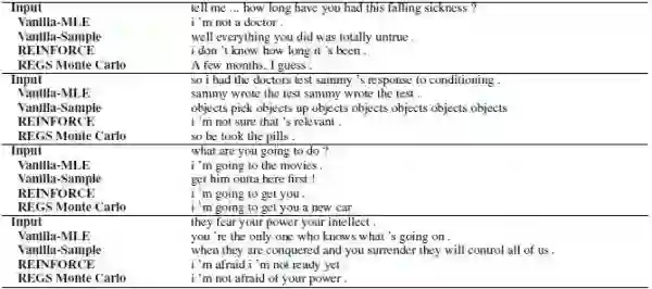 RL+ GAN 利用强化学习中的 Reward 机制以及 Policy Gradient 等技术,巧妙地避开了 GAN 面对离散数据时梯度无法 BP 的难题,在使用强化学习的方法训练生成器 G 的间隙,又采用对抗学习的原版方法训练判别器 D。 在 Conditional SeqGAN 对话模型的一些精选结果中,RL+ GAN 训练得到的生成器时常能返回一些类似真人的逼真回答(我真有那么一丝丝接近 “恐怖谷” 的感受)。