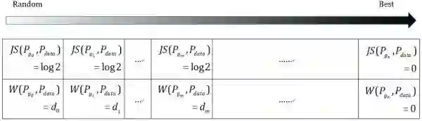 使用 Wasserstein-Divergence 训练的 GAN 相比原版的 GAN 有更加明显的 “演化” 过程,换句话说就是,WGAN 的训练相比与 GAN 更加能突显从 “不好” 到 “不错” 的循序渐经的过程。从上面的 2.2 节,我们知道 JS 散度在面对两个分布不相重叠的情况时,将发生 “异常”,计算结果均为,GAN 的训练过程也是这样,也许在很长一段训练的过程中,JS 散度的返回值都是