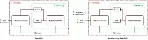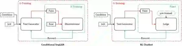 。看似差别很很小,实际上 RL + GAN 的文本生成技术与单纯基于 RL 的文本生成技术有着本质的区别:在原本的强化学习对话生成中,虽然采用了 AI 互相对话,并设定了 jugle 进行打分,但这个 jugle 是预训练好的,在对话模型的训练过程当中将不再发生变化;RL + GAN 的文本生成乃至对话模型则不同,鉴别器 D 与生成器 G 的训练更新将交替进行,此消彼长,故而给出奖励得分的鉴别器 D 在这里是动态的(dynamic)。