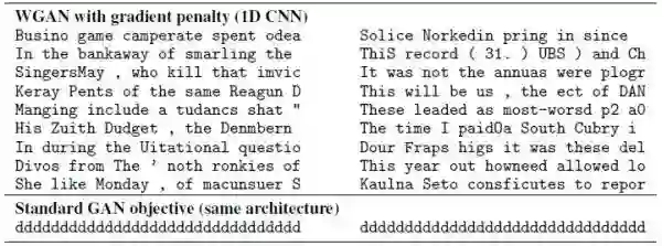 既然 Wasserstein 散度能够克服 JS 散度的上述弱点,那么使用 Wasserstein GAN 直接吸收生成器 G softmax 层 output 的 Distribution Vector 与真实样本的 One-hot Vector,用判别器 D 进行鉴定,即便判别器 D 不会傻到真的被 “以假乱真”,但生成器 output 每次更加接近于真实样本的 “进步” 总算还是能被传回,这样就保证了对于离散数据的对抗训练能够继续下去。不过 Wasserstein GAN 的原著放眼于对于 GAN 更加远大的改进意义,并没有着重给出关于文本生成等离散数据处理的实验,反倒是后来的一篇 “Improved Training of Wasserstein GANs”[11] 专门给出了文本生成的实验,从结果上可以看出,WGAN 生成的文本虽然远不及当下最牛 X 的文本生成效果,但好歹能以 character 为单位生成出一些看上去稍微正常一点的结果了,对比之下,GAN 关于文本生成的生成结果显然是崩塌的。