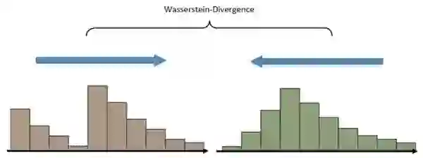 Wasserstein GAN 对 GAN 的改进也是从替换 KL-Divergence 这个角度对 GAN 进行改进,其详细的妙处大可参看文献 [10,13],总的来说,WGAN 采用了一种奇特的 Divergence—— “推土机 - Divergence”,Wasserstein-Divergence 将两个分布看作两堆土,Divergence 计算的就是为了将两个土堆推成一样的形状所需要泥土搬运总距离。如下图: