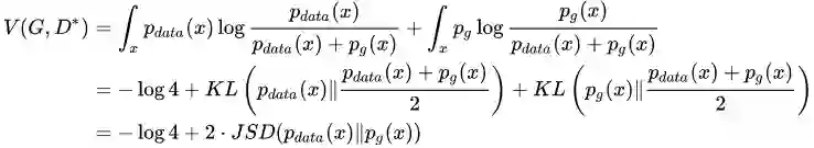 所以,当生成器 G 能生成出与真实样本一样分布的样本,那么 ok,就达到最好的结果,然后大家注意一点,这里生成样本的 loss 衡量方法是 JS 散度。