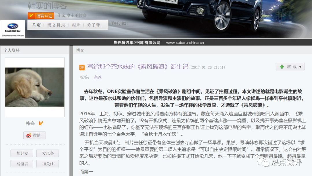 正如之前有业内人士说,韩寒在博客时代对各种敏感话题拿捏非常之准,从不趟雷,懂得进退。而在那一年,新浪博客点击量超过1亿的已有两位,超过5000万的有5位,超过100万的博客高达908位。
