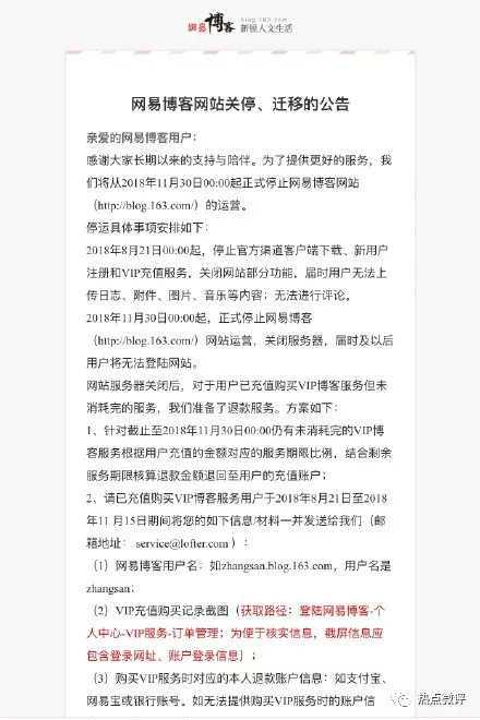 8月20日,网易博客首页发布了《网易博客网站关停、迁移的公告》,宣布将从2018年11月30日00:00起正式停止网易博客(blog.163.com)运营,关闭服务器,用户将无法登录网站。