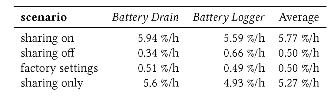 f. 电池耗尽:由于广播和发现步骤(预连接)必须连续执行,因此通过实验验证长时间在后台进行广播、发现和共享信息是否可行。由于无法模拟现实场景,因此只测量应用程序的预连接电池消耗量,这就为电池消耗量提供了一个下限。将两个设备重置为出厂设置。跟踪三种不同情况下的电池电量:(1)在后台运行并打开共享的应用程序;(2)关闭共享的应用程序;(3)出厂设置条件下,在所有三种情况下,显示器都关闭。实验结果见表 2。