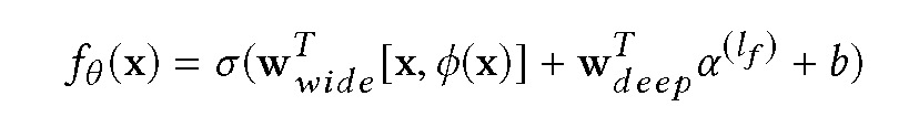 其中,w_wide 表示广度模块的权重,w_deep 表示深度模块的权重,phi(x) 表示交叉产品变换,alpha 为深支末级激活。