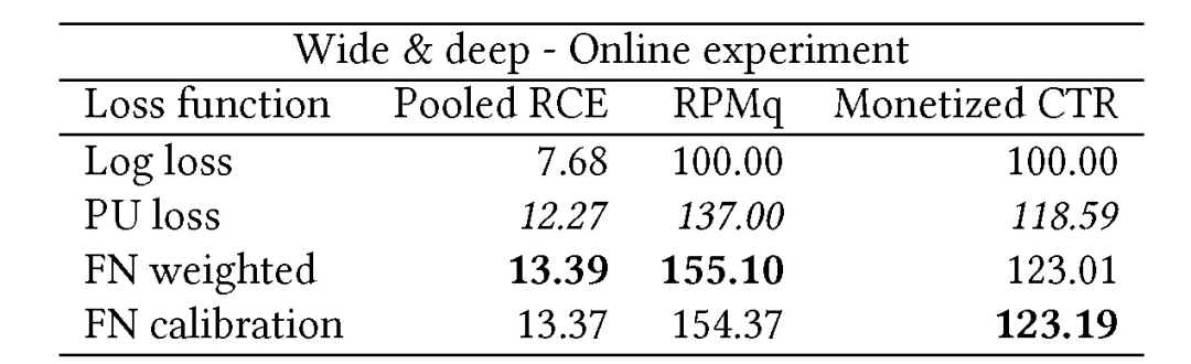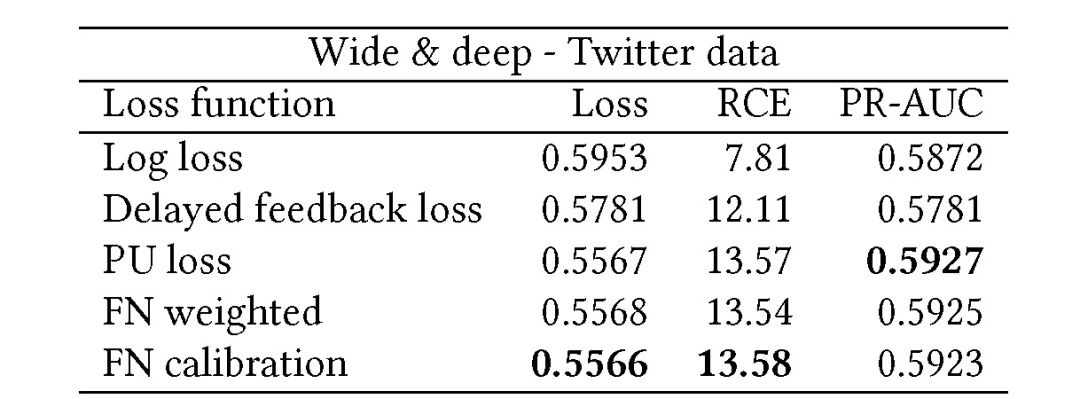 表 4. 广度-深度模型以及性能最佳的损失函数(Twitter 数据)的在线结果