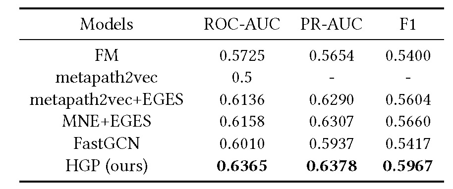 对比模型:metapath2vec、metapath2vec+EGES、MNE+EGES、FastGCN、HGP。