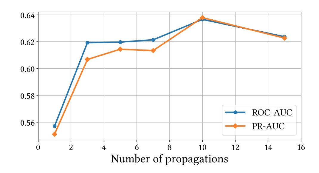 图 2 给出不同传播步骤下 HGP 的性能。HGP 需要至少两个步骤才能获知统一组内其他节点的信息(用户节点→组节点→用户节点)。如果传播步骤为 4 步,则可以接近具有共同偏好的用户的其他首选项(用户节点→组节点→用户节点→组节点)。传统架构的性能随着传播步骤数目的增加而降低。而 HGP 在步骤为 10 时达到最佳性能,并成功地避免了过平滑现象。