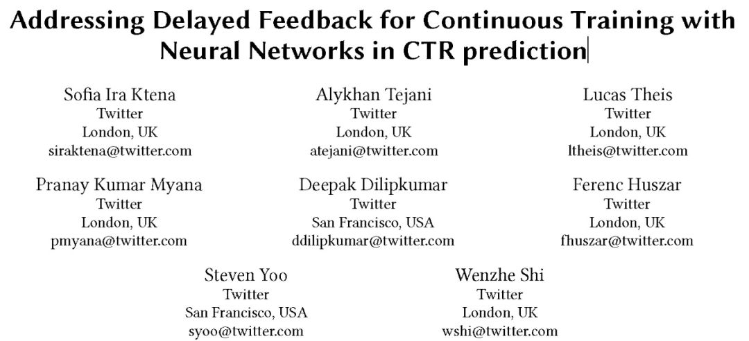- Addressing Delayed Feedback for Continuous Training with Neural Networks in CTR prediction,提出一种基于损失函数的神经网络模型,用于解决连续学习过程中的延迟反馈问题。