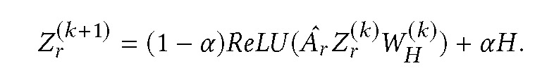 对于一个异构图 G,节点映射函数为ϕ : V → O,边映射函数为ψ : E → R。Ar 表示包含类型为 r 的边的邻域矩阵。Aˆr 表示 Ar 的对称规范化邻接矩阵。将节点划分为不同种类:X1,X2, ...,X|O|,分别应用预测神经网络 Hi=f_i(Xi),将结果连接起来得到:H =[H1,H2, ...,H|O |]。HGP 使用具有附加可学习权重的非线性传播来学习深度节点表示: