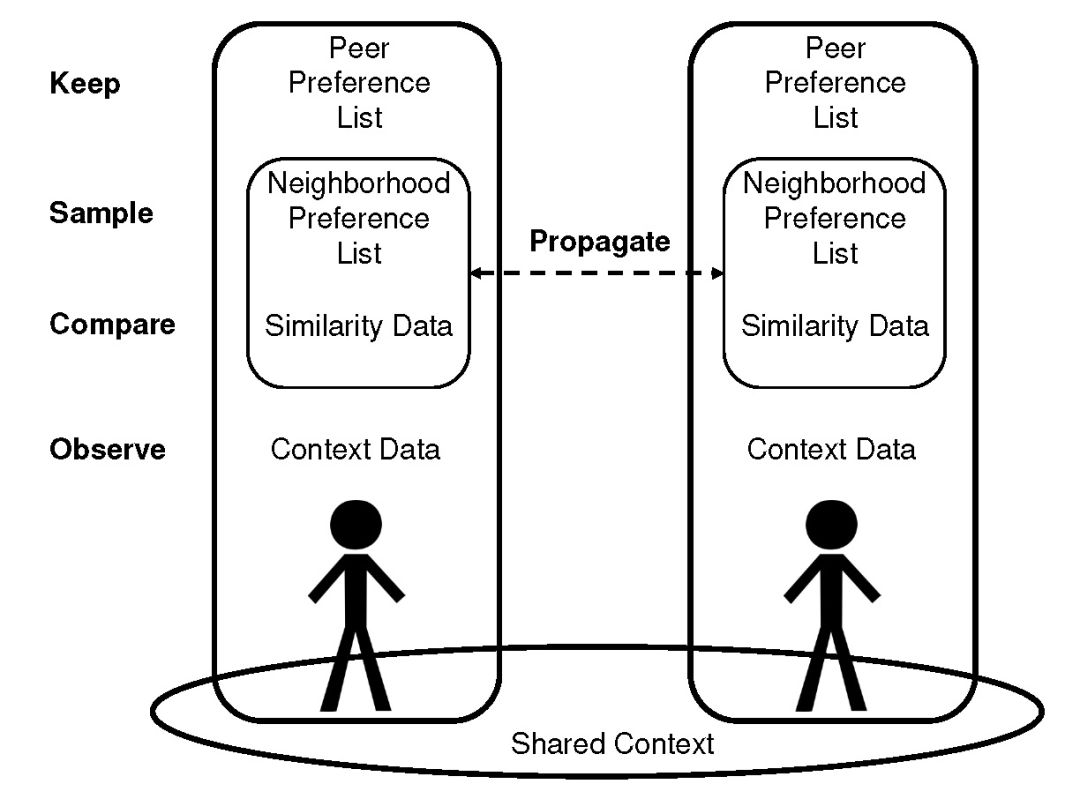 当两个或多个对等设备在物理空间上相互靠近时,智能手机建立快速和安全的配对连接,并交换他们的邻域首选项列表和相似数据。在上述传播过程中,接收到的数据包含上下文数据,例如描述相遇的时间或位置。