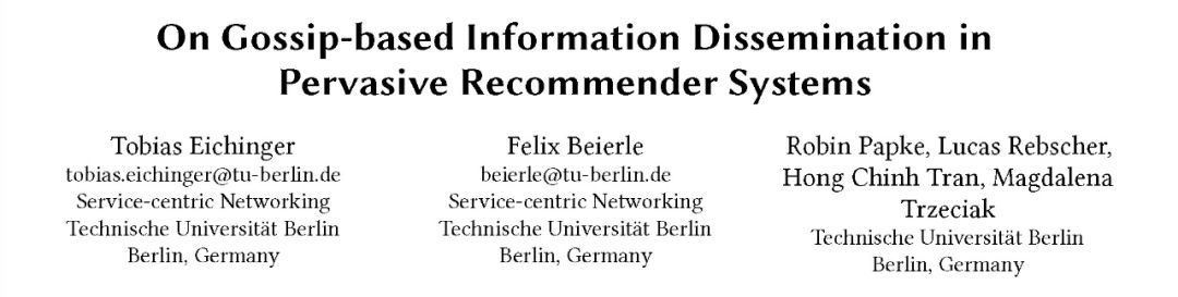 - On Gossip-based Information Dissemination in Pervasive Recommender Systems,提出一种离线手机端与邻近区域内其他设备之间推荐评分数据交换问题的普适推荐系统策略。