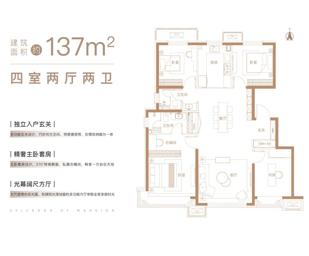 精研是对高审美的精准把握。南向大横厅、三面宽,在98m²至137m²的户型里都被精心纳入设计。137m²的户型南向总面宽高达约11.7米,一天里最好的阳光会透过超大宽幕的玻璃落入房间,窗外的近景是小区园林,远处延展到整个城市的天际线。