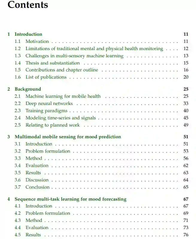 我们回顾了移动健康机器学习改进带来的一些潜在好处,采用传统方法时会出现哪些限制,以及在处理含噪的传感器数据时会遇到哪些挑战。形式上,总体目标可以表述为:改进机器学习方法,用于由消费者移动和可穿戴设备生成的动态和静态、多任务和有限监督的观察、回顾和纵向数据,用于最终目标是改善健康和福祉,重点是心理和身体健康。我们通过首先评估现有方法在大规模身心健康数据集上的潜力,然后提出优于当前方法或提供新见解的新模型来证实这一说法。我们的方法利用并扩展了多模态融合、多任务学习、时间序列预测、迁移学习和自我监督学习的范式。特别是,本论文解决了以下四个研究问题: