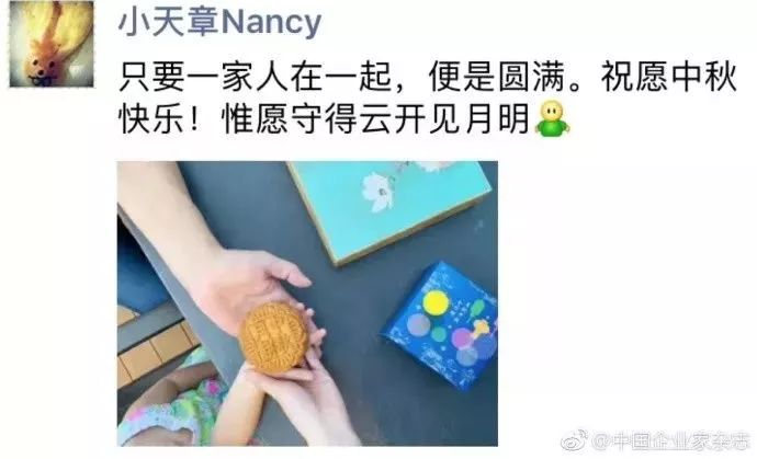 刘强东明州事件发酵至今,直到中秋团圆夜,章泽天才用一条朋友圈表明了自己的态度。“只要一家人在一起,便是圆满。”朋友圈配图中,一家三口手捧月饼。 (中国企业家)