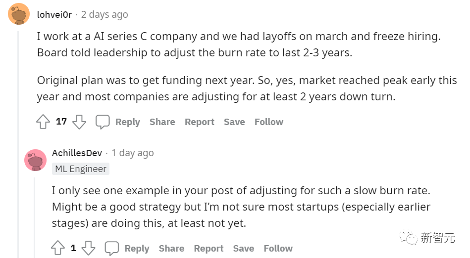 我在一家人工智能公司工作,我们在3月进行了裁员,并冻结了招聘。董事会告诉领导层要调整烧钱的速度,先维持个2-3年。