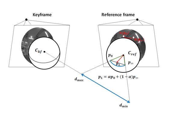 成功跟踪帧后,我们执行立体匹配以细化候选点的逆距离。 当候选点被包括在光度集束调整中时,该估计距离用作初始化。按照一定步长沿着极曲线搜索对应关系。极曲线的数学描述如下: