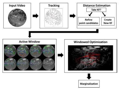 活跃帧数量为常量。它通过跟踪最新的关键帧及其稀疏距离图(步骤1)来跟踪每个新帧中的摄像机运动。如果观察到的场景中的变化对于最新的关键帧太大,则从新帧创建关键帧(步骤2)。 然后,我们边缘化一个或多个帧以保持关键帧的数量受到限制(步骤3)。