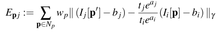 DSO联合优化最近帧窗口内的相机位姿,点的深度和仿射亮度参数。作为直接法,优化目标是光度一致性。DSO也将图像形成过程的光度校准考虑在内。表达两帧之间的光度误差的能量函数如下: