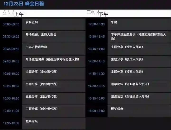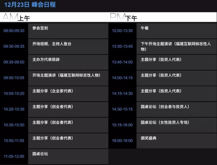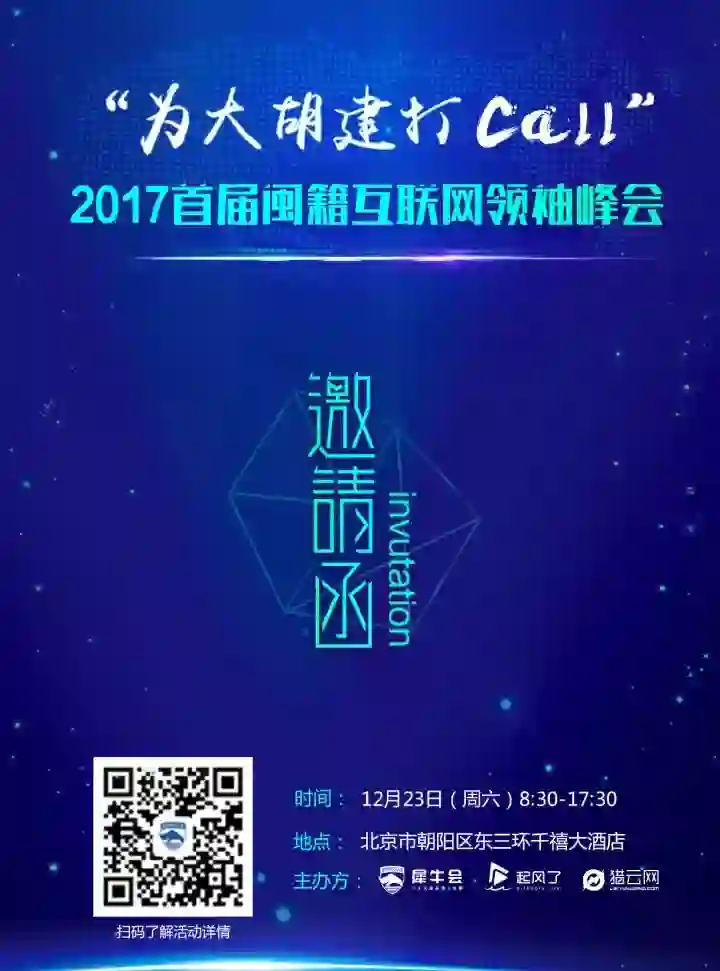 此次峰会得到10+顶级闽籍行业大咖分享创投经验,30+闽籍创投机构鼎力支持,50+闽籍优秀创业者分享行业干货,20+闽籍主流媒体助阵,1000+闽籍互联网从业者欢聚一堂。本次峰会将会评选出“2017年度闽籍创业领军人物”、“2017年度闽籍新锐创业者”及“2017年度闽籍杰出投资人”奖项,用世界级的“胡建话”,论互联网的大未来。