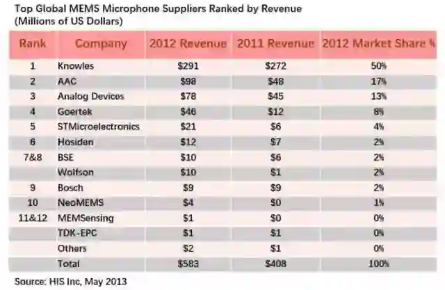 排名全球第四大已封装MEMS麦克风供应商的是韩国BSE,其业绩表现来自于拥有苹果最大对手三星这个大客户;BSE的2013年营收与2012年相较,成长率超过250%。紧追在BSE之后排名第五大的厂商则是欧洲业者意法半导体(ST),该公司的MEMS麦克风业务因为赢得了iPad设计案而持续扩张。
