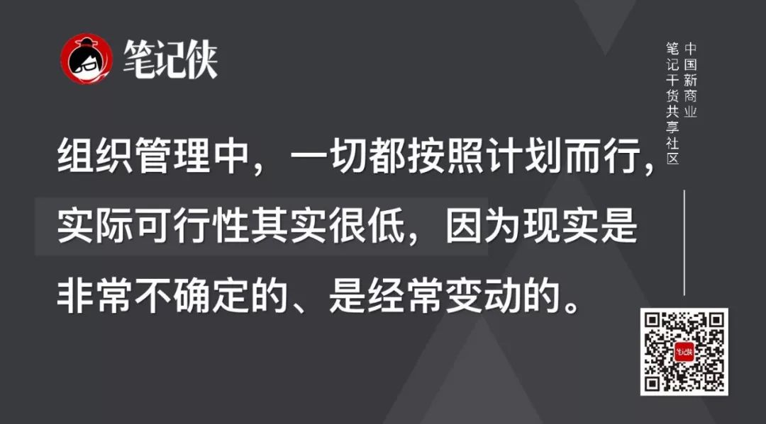 组织管理中,一切都按照计划而行,不过是句冠冕堂皇的话,这样的实际可行性其实很低,因为现实是非常不确定的、是经常变动的。