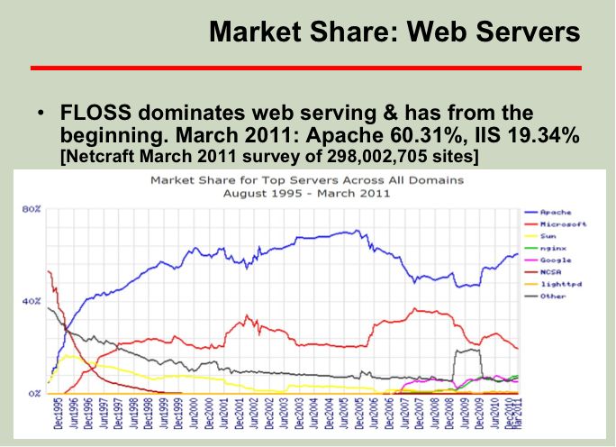 David. Wheeler构建了一套指标体系,用来说明开源软件的独特优势。用非常翔实的数据,分析指出,开源软件在各个领域的市场上都拥有较大的市场占有率、更可靠稳定的性能、更高的安全性以及规模效应。(例子:下图为web server以及智能手机操作系统的比较)