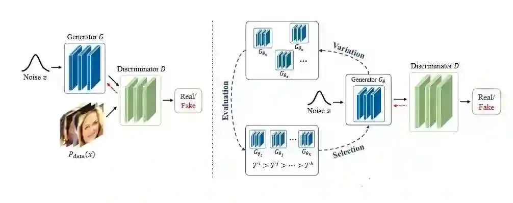 最初的GAN框架(左)与E-GAN框架(右)。在E-GAN框架中有一群生成器 G θ 在动态环境中发展 - 鉴别者 d 。该算法涉及三个阶段:变化,评估和选择。最好的后代保留下一次迭代。