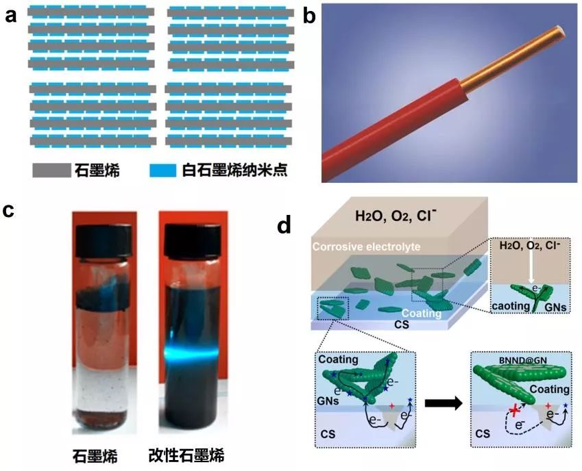 图4 白色石墨烯封装石墨烯示意图(a)和铜线的绝缘皮层图(b),改性石墨烯的高效分散(c)和超防腐机理图(d)。