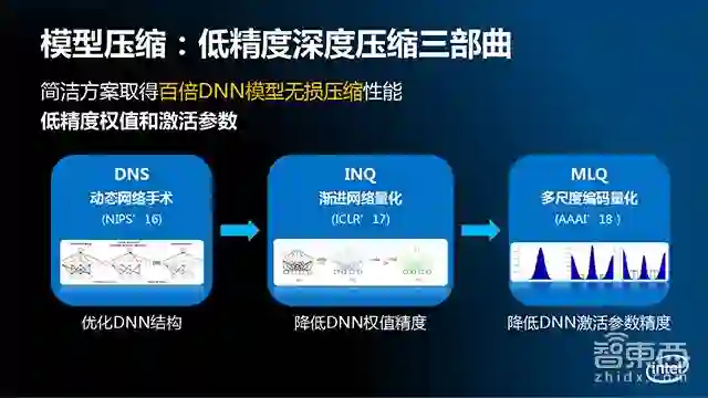 英特尔在此方向上提出了一套低精度的深度压缩解决方案,它可以将DNN的权重参数和激活值表述成低精度的二进制表示,并且,可以实现百倍级的无损压缩,这样就为深度学习推断在硬件和软件上的加速奠定了基础。