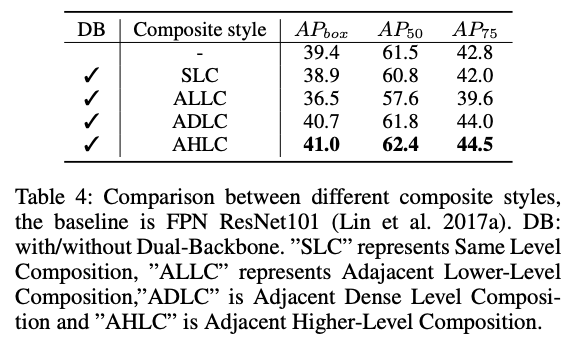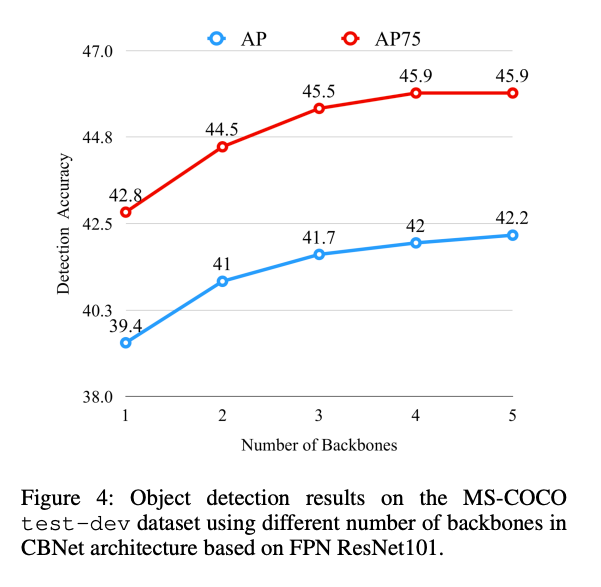 下图为作者在COCO test-dev数据集上的实验,Single代表单模型,DB为对两个骨干网进行合成,TB为三个。