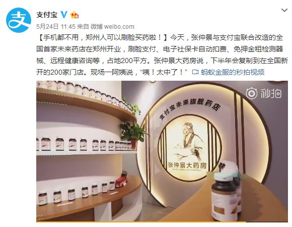5月24日,支付宝与张仲景联合改造的全国首家未来药店在郑州开业,位于河南郑州二七区南彩路,店名就叫“支付宝未来药店”。
