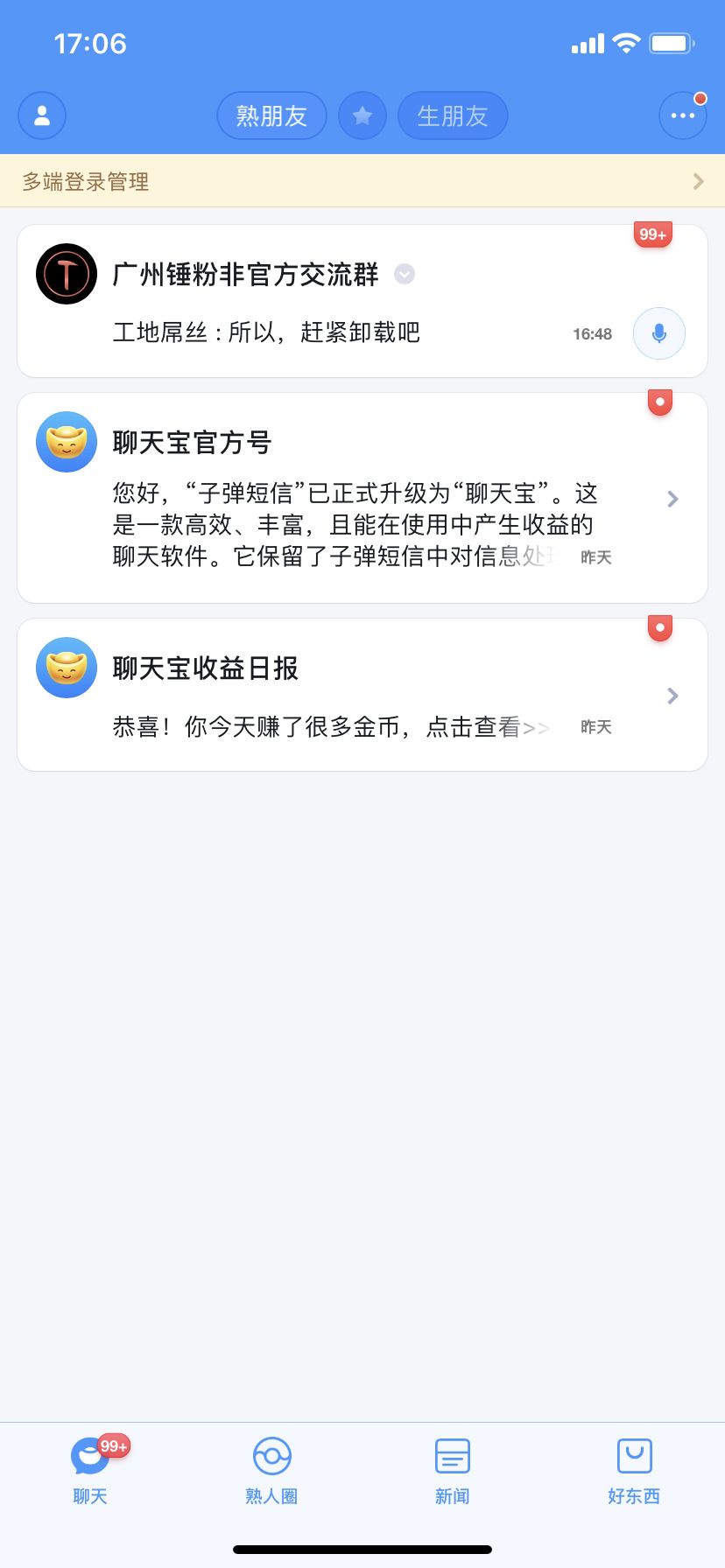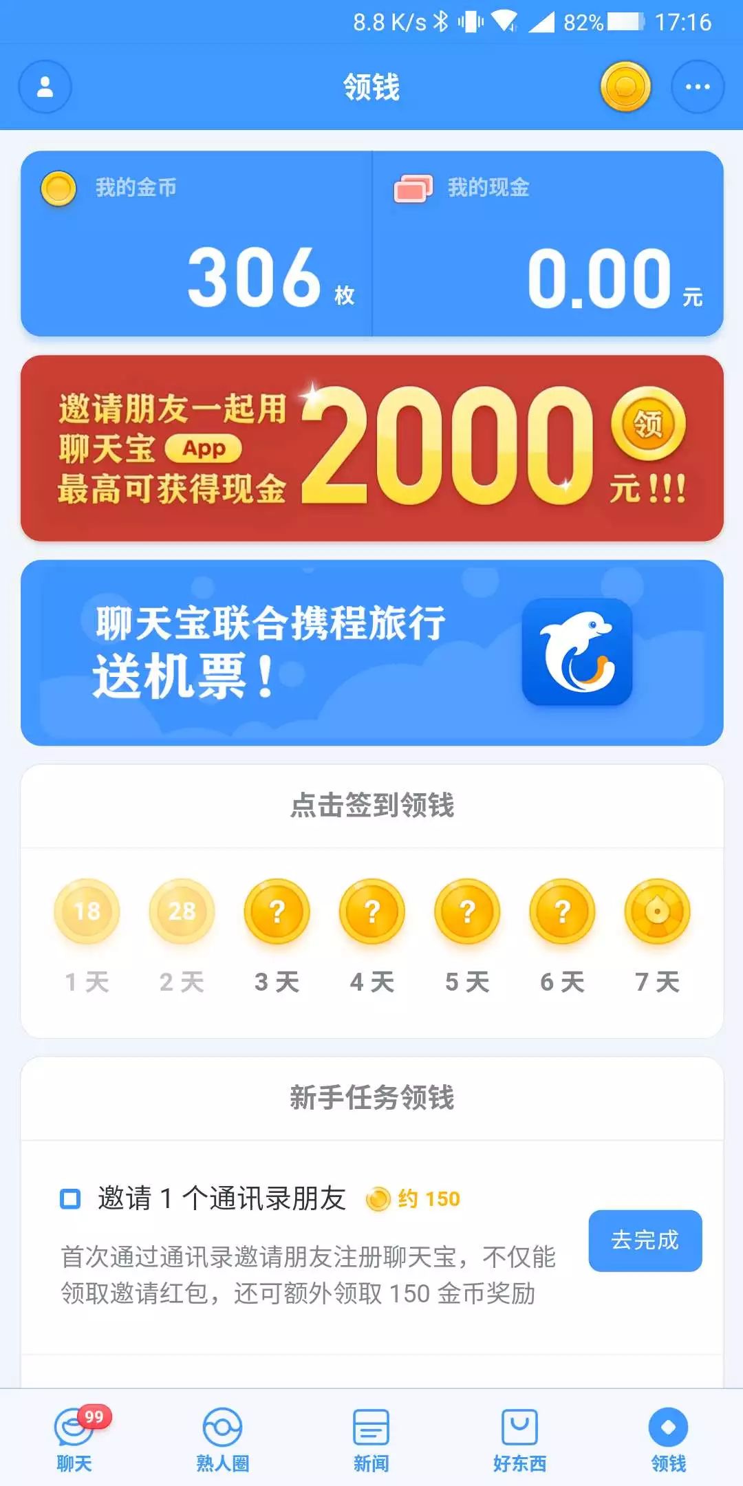 邀请朋友能赚钱,聊天能赚钱,看新闻能赚钱,玩 H5 游戏能赚钱,发“熟人圈”内容能赚钱,甚至改名换头像,都指向了“能赚钱”这一暗示。不过聊天宝并不是直接给你发现金,而是通过完成各种“任务”获得金币,然后将一定金币可以兑换成人民币这样子。