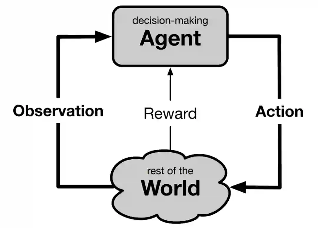 那么决策智能体与什么进行交互呢?答案是它能与所有不是智能体的一切事物产生交互,这可以被称作它的环境或世界。这两个术语与特定学科没有强关联,但本文选择世界的原因在于它更简单,同时不与任何特定学科产生关联的方式令人印象深刻。如下图所示,为了完成智能体与世界交互的场景,我们必须为每个方向上传递的信号命名。可以很自然地说,智能体采取了行动,并接收到了感知或观察。这里使用了观察,因为它是用于此目的的既定术语,并且避免了关于机器是否有感知的形而上学讨论。在标准用法中,观察指的是可能不完整的关于世界状态的信息。