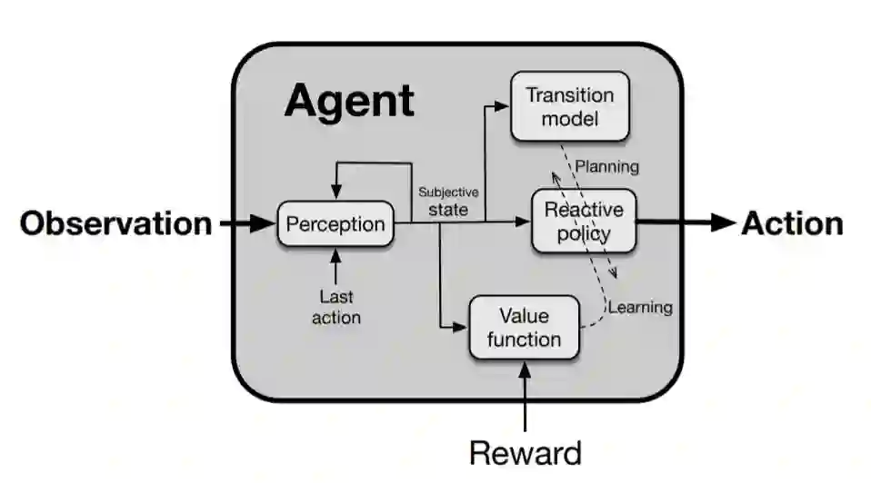 感知组件可处理观察、动作流以产生主观状态,这是迄今为止对智能体 - 世界交互作用的总结,对于选择动作(反应策略)、预测未来奖励(价值函数)和预测未来主观状态(转换模型)很有用。状态是主观的,因为它是相对于智能体的观察和动作,可能不符合真实世界的内部运作。通常,主观状态的构建是固定的,在这种情况下,智能体被假定为直接接收主观状态作为一种观察。例如,在 Atari 游戏中,主观状态可能是最后 4 个视频帧及其相邻动作。在贝叶斯方法中,主观状态确实与世界的内部运作有关系:主观状态的目的是近似世界内部使用潜在状态的概率分布。在预测状态方法中,主观状态是一组预测。在深度学习中,主观状态通常是递归人工神经网络的瞬间活动。在控制理论中,感知组件的计算通常被称为状态识别或状态估计。