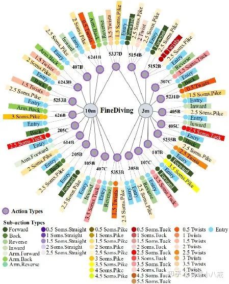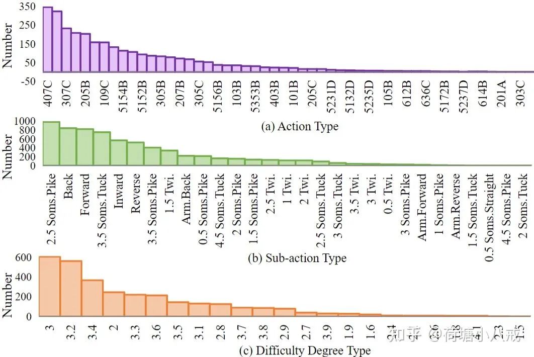 FineDiving数据集包含3000个样本,涵盖52种action types、29种sub-action types以及23种难度难度系数,如图(4)所示。